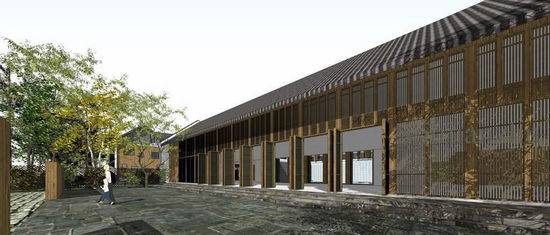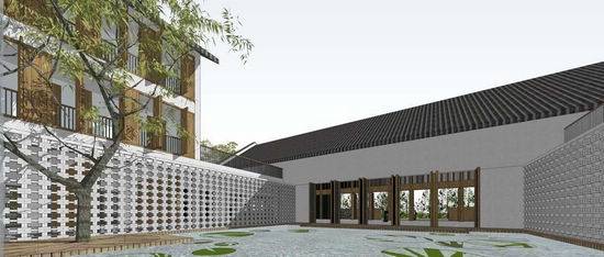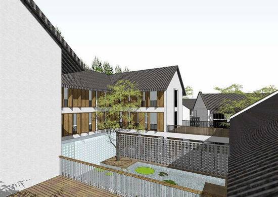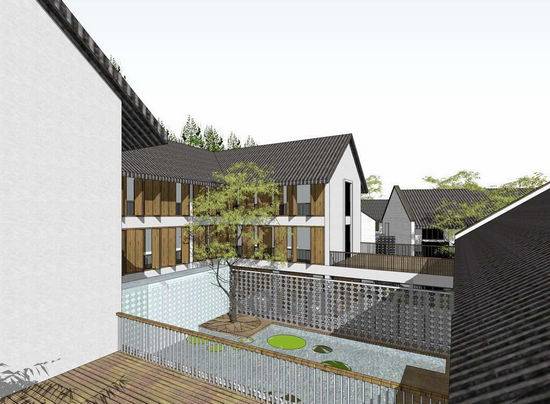 项目基地位于湖南株洲市云田镇云峰湖村,地势背山面阳,环境优美。整个建筑群顺应山势,由多个院落串联而成,形成一组看似自由,实则与环境有机统一的建筑群落。 建筑以两层为主,选择朴素的地域乡土建筑风格,以价格低廉的白色涂料、小青瓦、木门窗为主要建筑外立面材料,以毛石、青砖等作为主要的景观铺装材料。基地内的水塘、树木、竹林与建筑有机结合,远处的青山绿水,相映成趣,无意中营造出了“采菊东篱下,悠然见南山”的世外桃源般的意境。