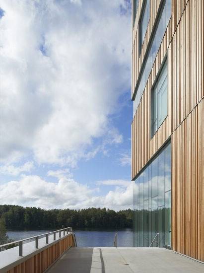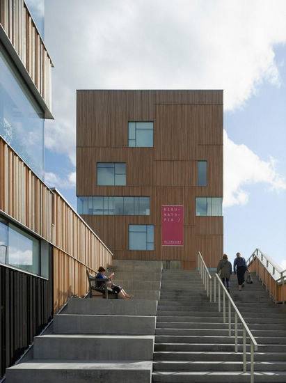 艺术博物馆位于瑞典北部的Umea大学校园里。新校区还包括美术学院、设计学院、建筑学院。计划博物馆占地500平方米,总建筑面积达3500平方米。凭借其在河边明显的位置,博物馆已经成为该地区的一个里程碑。 该博物馆上下共有三个展厅,大的方形的大厅是自由开放的,由四条柱子支撑结构。在展馆周围柱子之间的空隙使得内部采光充足。除了光效,壁龛允许自然减免从艺术探索,越往上走越多,就越会被河流、城市和景观所吸引。四条支柱不仅支撑建筑主体,也为所有的垂直运动:电梯井、楼梯、管道和通风管道。入口和大厅横跨三个较低水平,包括儿童博物馆商店、车间和一个礼堂。