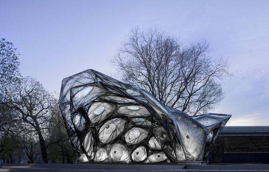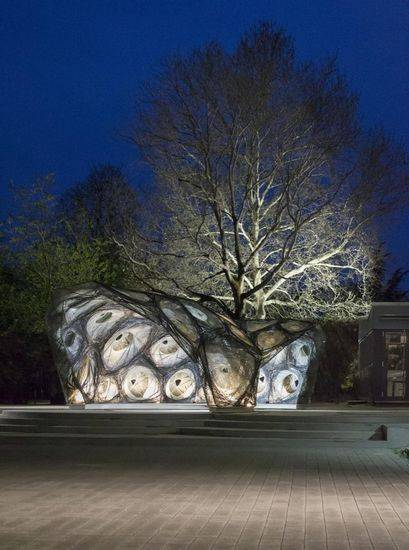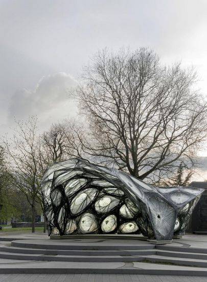 斯图加特大学的计算设计院(ICD)和建筑构造和结构设计院(ITKE)建造了另一个仿生研究馆。该项目是系列研究馆成功的一部分,展示了新颖设计、仿真的体系结构和制造工艺的潜力。该项目的规划和建设由学生与生物学家、古生物学家、建筑师和工程师研究团队进行了一年半的时间。 该项目的重点是增强聚合物结构的天然纤维复合材料壳的仿生研究,和纤维的新型机器人的制造方法的发展平行的自底向上的设计策略。目的是缠绕技术的模块化发展,双层纤维复合材料结构,从而降低了所需的模板到最低,同时保持了很大程度的几何自由。