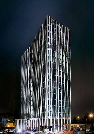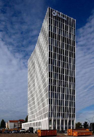 欧洲城市是新市区40公顷的总体规划直接到火车站北侧。总体规划将容纳一个艺术校园、码头、餐馆、住宅。这座为法国能源公司道达尔设计的建筑完成于2012年秋季,独特的高层建筑为道达尔德国总部的500多名员工提供了明确的标识感和身份认同。该项目高68米,共18层,包括入口大堂和餐厅,办公室,和技术层。可持续DGNB银证书早期目标导向的规划决策。这大部分是通过智能幕墙系统和能源再利用实现。