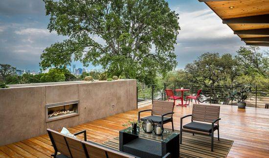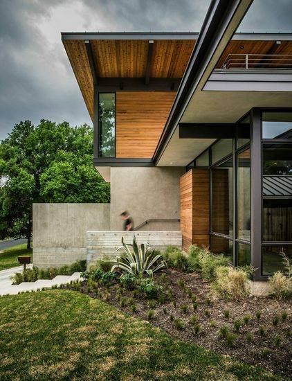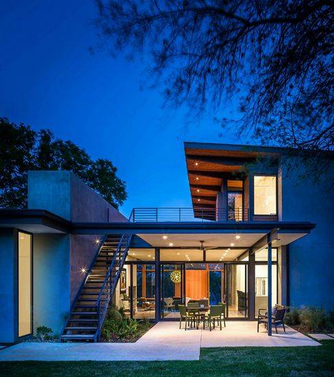 该项目是由A Parallel Architecture设计的,Paramount住宅位于南奥斯丁山顶边,是城区内的最高点之一,享有美丽的城市天际线和山地乡村风景。由于住宅所在地形陡峭,建筑局部埋入地下,机动车通道和停车位布置在下层,而生活空间及大悬挑屋顶平台布置在上层。错层的设计既符合当地城市规定,又最大化扩展视线、保护底层沿街面的隐私性。
