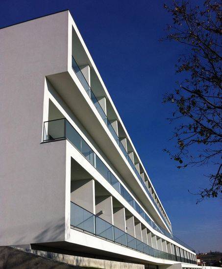 这种住宅楼项目包括60间卧室(三种不同类型)与管理及行政服务,员工设施,生活区和活动区,餐饮和服务区(厨房,储藏室,洗衣房和后盾设施),健康和水疗区,最后是技术区,储藏室和车库。 该场地是一个三角形的建筑区,并且土地大量下滑。因此,设计师选择了设计一个由两个结构组成的建筑物,它们是相互垂直的,形成一种“T”型。