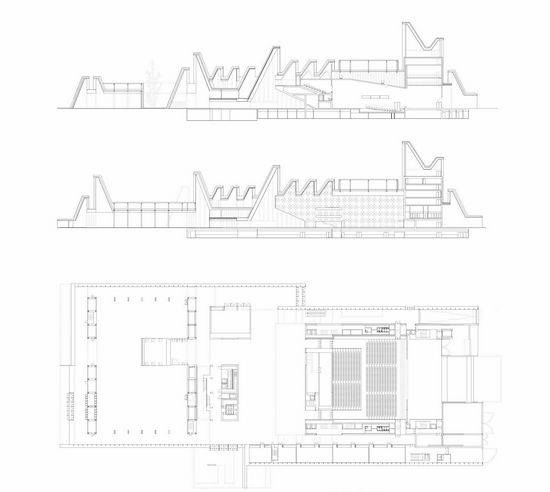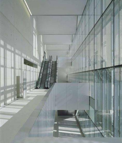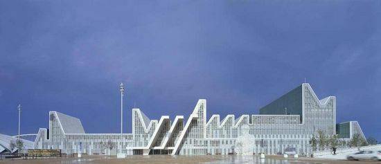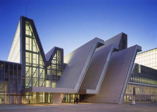 这需要快速完成这幢临时的2008世博会园区,用不同的特性显着先前引用的选区的意识,确定的这可以被定义为组合,而不是仅从概念或作曲点,而且在材料和施工方面的过程。项目的会议中心所有影响其空间、体积、形式、结构、构造和材料定义相继出现从创造欲望的组合,从基本单元:一个天窗、结构网格、混凝土面板、陶瓷片、外壳模块等等。线性天窗,项目的真正主角,开始作为一个折叠的平行平面,向南北交替开放,重复与变异的尺寸取决于内部空间的需要改变高度。