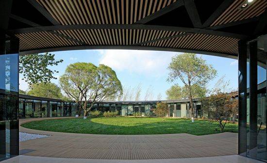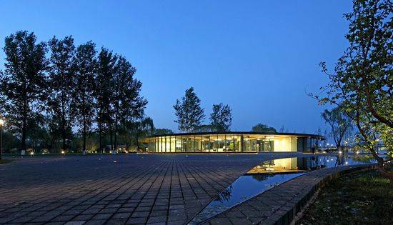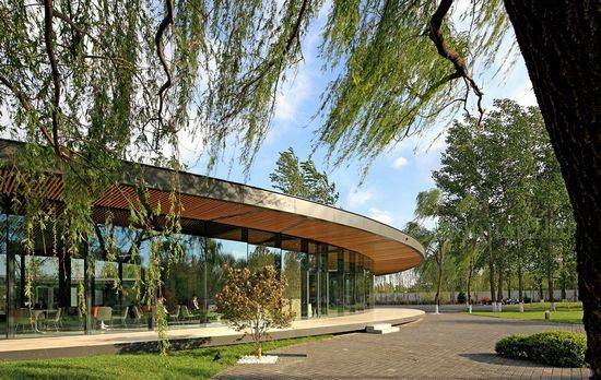 该建筑位于北京和河北省的交汇处。它是一个近二百万平方米的住宅和文化产业复合社区启动项目。这座建筑在开发初期是用于示范和接受,它将为整个社区提供服务在整个项目完成后。 该项目所处位置是一个天然的绿色空间,有很多各种巨大的树木。因而对环境的姿态变成设计的起点。浮在草看起来像隐藏在树林里闪闪发光的水晶环建筑。建筑物的形式是不规则的环。树木伸出来或在建筑物内。而不是故意用完美的曲线,形状已被轻轻地拉伸。这种不确定性实际上增加了建筑的自然属性。