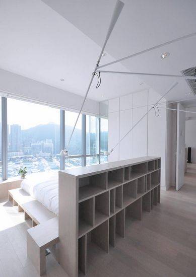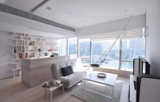 该公寓位于一座高层住宅楼在香港仔内,靠近鸭脷洲船厂。项目响应家庭办公文化的发展趋势,公寓设有大型全景窗户,对着香港仔海洋划船的风景,作为外籍夫妇一个平衡的平静和动态的家庭办公室。 设计灵感来源于布列塔尼传统的法国船屋,使用一个连续的带状蓝色墙壁“漂浮”并将所有不同区域联结在一起。新设计概念拆卸现有的两个隔断墙,从而创建出毗邻开放工作室的一个大卧室和大休闲室。打开了空间增加了全景窗口视野,创建了室内体验室外的划船环境。