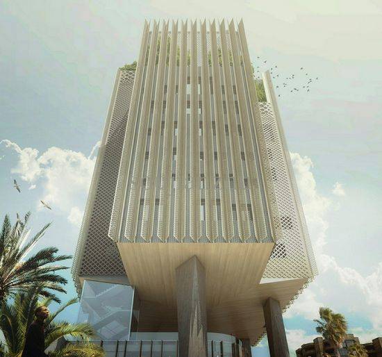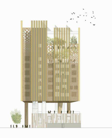 Mikou Design Studio工作室已经宣布计划为设在刚果的Africanews设计总部大楼。项目旨在“呈现出强大的视觉冲击力”,成为布拉柴维尔的天际线,木包裹的塔被悬浮于四个“图腾般的”支柱之上,下面为两层玻璃体量,并配有一个植物屋顶露台庇护的全景餐厅。