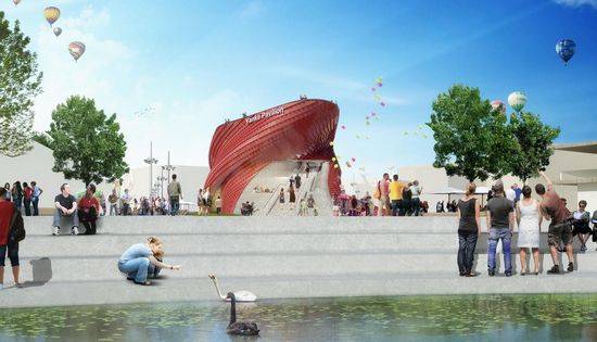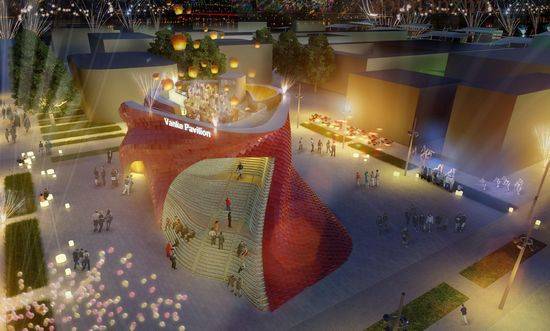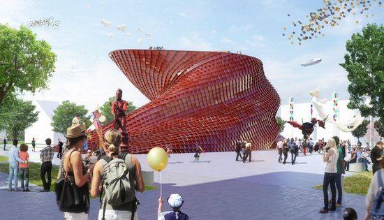 该项目是由Daniel Libeskind设计的,这是万科首个为2015年米兰世博会有史以来海外展馆。外层有着自动清洁、空气净化的金属瓷砖,是由Libeskind与意大利公司Casalgrande Padan合作设计的,“红色的蛇状”结构重新诠释中国传统的食堂(餐厅)。 万科董事长王石说:“城市增长的惊人速度确实使我们不得不面对社会解体的风险状况。这就是为什么万科选择了“食堂”作为其馆的主题,中国传统的社会结构,生活在当代社会下的各种形式的今天,代表一个可能在健康,环境清幽的社交。”