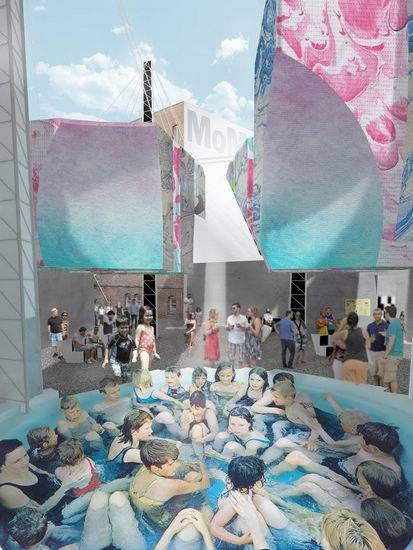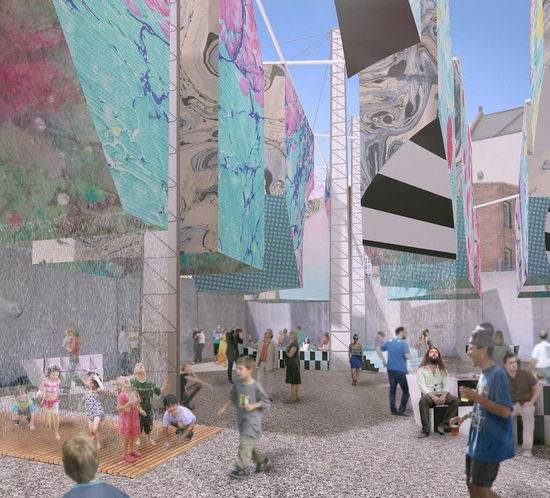 冰世界作为一种神奇的城市生活展开。块体边缘的水滴好像他们正在融化,创造空间像在下雨而不是墙壁的空间。桶形拱顶天花板引方直接的阶段和博物馆。在大园形拱顶下形成一个冰川湖。整个街道的墙壁了一系列错综复杂的大理石图案作为公民一种寻路的本能。 五十英尺的Rohn塔容纳整个形态,一张拉整体框架采用电缆地面。这些塔,反过来,是固定在地面上的螺钉通过地面传播的基础。波兰代表结构的想法,但他们也包括巨型的进气口和排气保持凉爽的空气通过庭院的时刻;在南方,三个冷调白杆接受盛行风吹过水,而在北面三个热调黑色的柱子绘制出温暖的空气通过烟囱效应。