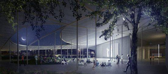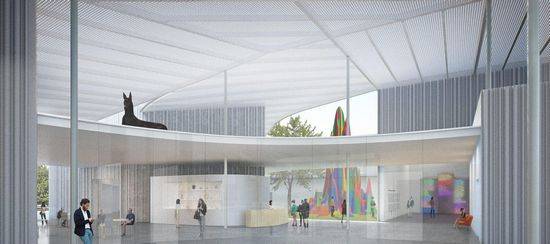 该项目是由SO-IL设计的,位于加州大学校内,校长认为该方案不同于传统的博物馆概念,连接室内外空间的是弯曲的玻璃墙,上面是50000平方英尺的钢遮蓬。晚上从内部透出光来,该项目成为校园的亮点。 作为总体的移动,设计方案提出了一个50000平方英尺渗透性的“大遮蓬”。这个开放的屋顶独特的造型呈现为校园的新象征。遮蓬上方延伸的部位,模糊的边缘,创建一个活动和景观尺度的感觉。遮蓬作用于两个重要方面:第一,以提供实验、基础设施和活动的舞台;第二,作为城市装置,创建校园轨迹的新的重力活动中心。遮蓬变换成不同的空间领域的站点。在晚上,遮蓬成为校园的亮点,远远超越城市以外的灯塔。