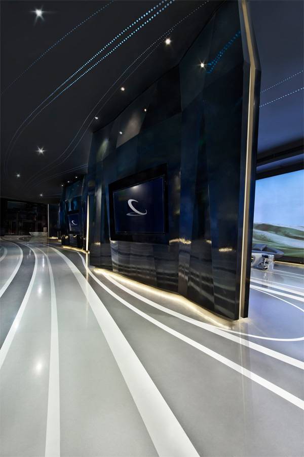这个销售俱乐部室内设计的设计灵感来源于full-of-tensile跑车的曲线。设计师将这些曲线很好的运用到了地面和天花板上,流畅的线条使得视觉空间被扩展了。宝石切割工艺在墙壁的应用使得墙壁上似乎有一个光柱鼓出来。通过或大或小,或粗或细,或彩色或黑白,或冷色或暖色的灯光,以及其他视觉传达方法的运用,让这个空间看起来更加的宽敞。清晰的分层和温和的色调使得整个空间有种外太空的感觉。