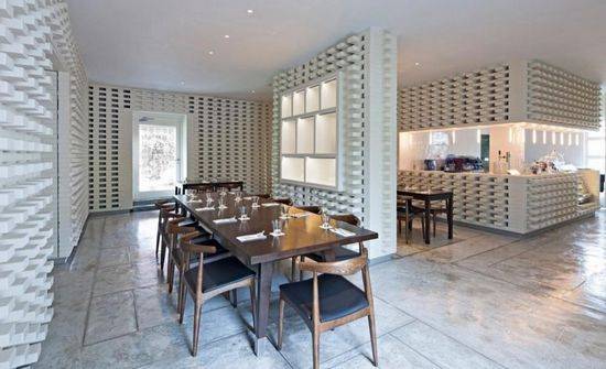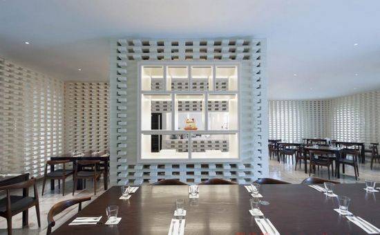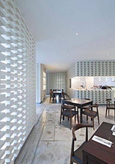 一个简单但戏剧性的内部包装漆成白色的砖墙,包围公社主餐厅的垂直表面,连续穿孔屏幕由标准实心砖交替组成,垂直旋转向上向下,引用本世纪中叶的热带通风结构的通风屏幕。晚上,光学关系倒置,餐厅会出现一个发光的灯笼,包裹内部历史和保存完好的殖民时期的建筑。垂直砖图案巧妙地计划,有蹄类动物移动,以适应现有的柱,开口和空调。其效果是一个微妙的渐变,类似发现艺术家探索光学效应(光艺术)运动产生的光学效应。