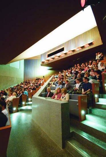 倾斜的地面,使设计师思考这个项目作为一种人造岩石,设计师将地面“慢”空间围绕'快'空间,得了新的高地,一个新的空间领土,一个升高的围墙花园。影院占据了交错之间的空间。更衣室和舞台降于基座中。飞塔项目进入剧院的围墙花园。剧场地板遵循场地轮廓,形成一个“室内景观”。