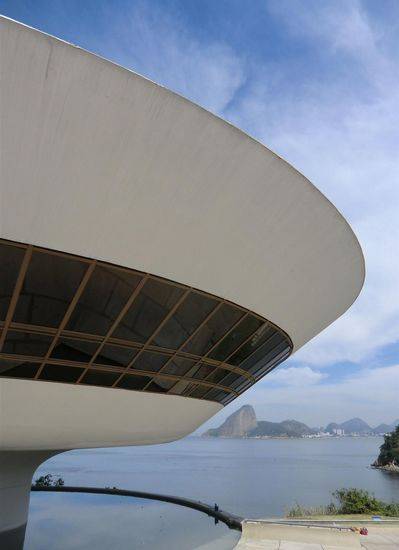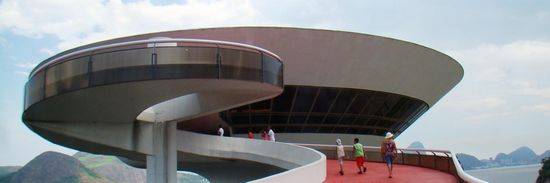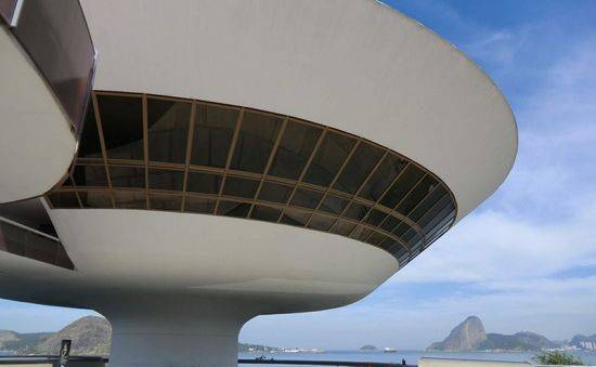 尼泰罗伊当代艺术博物馆(MAC)由巴西着名建筑师Oscar Niemeyer设计,并于1996年完成。这个标志性的飞碟形结构位于尼泰罗伊瓜纳巴拉海湾一个悬崖边上,一览约热内卢城市全景。 说到MAC的岩石悬崖边场地,Niemeyer称“领域是窄的,四周被大海包围,因此解决方案自然就来了,”这“自然,”直观的解决方案,是一个优雅、弯曲的结构,从一个水盆地上升,创建一种环境的轻盈感,并可欣赏瓜纳巴拉湾(Guanabara Bay)、休格洛夫山(Sugarloaf Mountain)全景。虽然经常被描述为飞碟状的MAC, Niemeyer的诗意意图表现“从地面”和“不断增长和蔓延”形式出现,像一朵从岩石升起的花。