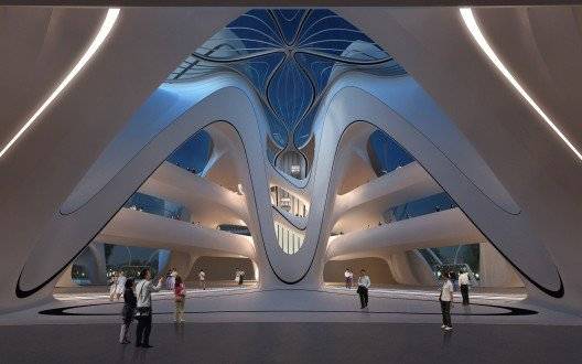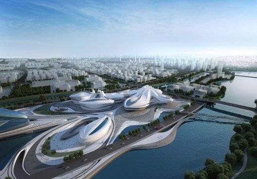 长沙梅溪湖国际文化艺术中心总建筑面积12万平方米,包括大剧院、小剧院与艺术博物馆三大主体功能,造型犹如一朵朵绽放的芙蓉花。该建筑由扎哈·哈迪德建筑师事务所设计,已于2012年底奠基开工,预计2015年建成。