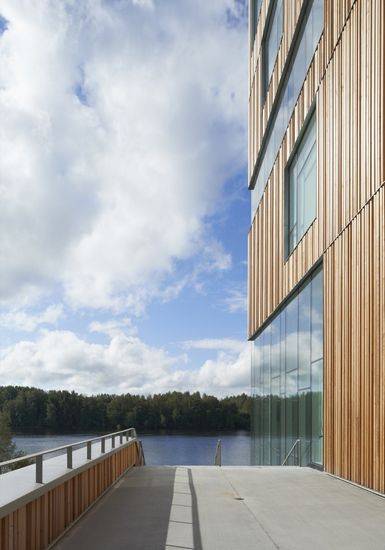 艺术博物馆位于瑞典北部的Umea大学校园里。新校区还包括美术学院、设计学院、建筑学院。计划博物馆占地500平方米,总建筑面积达3500平方米。凭借其在河边明显的位置,博物馆已经成为该地区的一个里程碑。该博物馆上下共有三个展厅,大的方形的大厅是自由开放的,由四条柱子支撑结构。在展馆周围柱子之间的空隙使得内部采光充足。除了光效,壁龛允许自然减免从艺术探索,越往上走越多,就越会被河流、城市和景观所吸引。四条支柱不仅支撑建筑主体,也为所有的垂直运动:电梯井、楼梯、管道和通风管道。入口和大厅横跨三个较低水平,包括儿童博物馆商店、车间和一个礼堂。