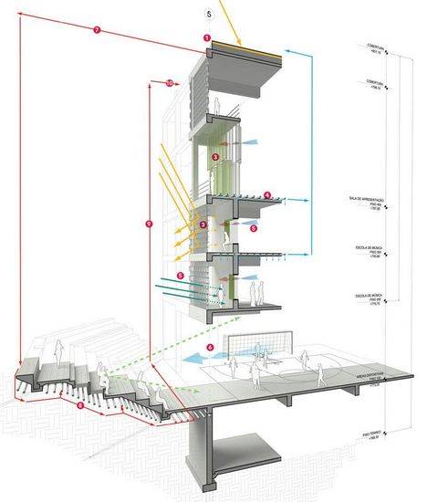 该项目是由国际urban think tank工作室设计的一个创意多功能大楼,项目从人文关怀角度开始设计,旨在重新思考当代建筑的物理局限性,将建筑从形式驱动转变到以目的驱动的社会建筑。这个近期的项目方案就是一种城市再思考和一个民用系统的建造,这个项目是一个多功能的公共建筑,低层区域主要包含不同的项目元素,它们最大限度地利用场地优势。这里包含公共交通,体育设施和音乐学校,还有工作室,表演大厅及附属的教室空间。上层则是为无家可归的人提供的住宿结构。项目是该地区一个重要的催化剂,将音乐及文化节目扩大到贫民区,形成一个新的网络,服务于来自社会各阶层的青年。同时设施也引入了商业空间,以激活街道空间和城市经济发展。
