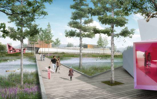 UNstudio获得了北京市延庆县“建筑创意区”国际竞赛的一等奖。 北京妫河•建筑创意区在一个尊重自然环境的新开放式环境中,展示了一种新的城市类型学特征。北京创意区的设计在两层尺度上涵盖了设计的简洁性:绿色纽带和城市结构。边缘的城市结构由两个交织在一起的、彼此区别而又联系的条带组成。在创意建筑公园里工作室和展馆布局遵循了中国园林的“步移景异”特征。整个场地变成了一个国际实验项目和设计实践的展示平台。通过对四个要素,“思考、开发、生产和销售”的产业链的有机组织和执行,所有的面向产品销售的流程平台在此得以建立。