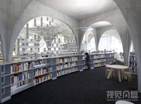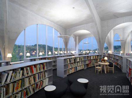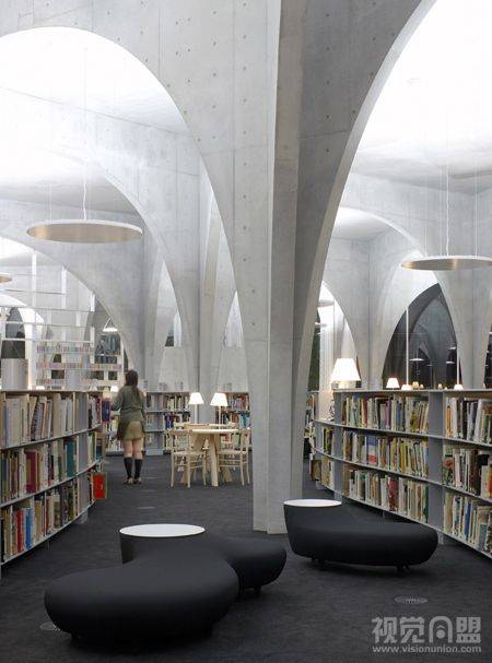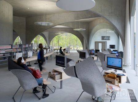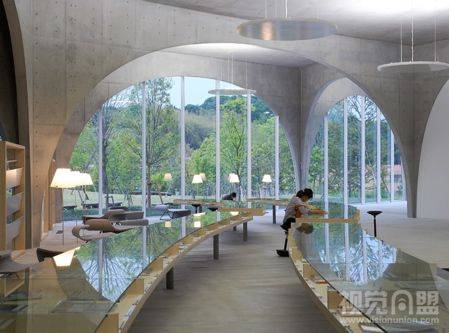 新建成的多摩美术大学图书馆由Toyo Ito的设计。位于东京郊区一个公园后面的略微倾斜的斜坡上。由于目前多摩美术大学的自助餐厅是唯一一个学生和学校职员共享的场所,Toyo Ito的设计首要诉求就是考虑如何让图书馆为所有人提供一个开放的公共空间。第一个点子就是底层开阔的长廊式空间,为人们穿越校园提供一条活动道路。为了让人们的流动和视觉自由地贯穿于建筑,他们开始考虑使用随机排布的拱形结构来营造一种感觉,让倾斜的地面和外面的公园风景和建筑保持连续。拱形用钢结构和混凝土做成,这些拱形结构相互交汇,这样可以让拱形的底部非常细小,而顶部可以承住二层的重量,这些拱形的跨度从1.8米到16米不等,但厚度统一为200毫米。这些交汇的拱形把空间柔和的划分成不同的区域,加上书架,不同形状的学习桌以及可用作公告牌的玻璃隔断等等,给划分而成的区域带来即有个体性又和整体空间保持连续的感觉。在倾斜的底层,有酒吧柜台样子的视频浏览地,放有最新期杂志的大玻璃桌子,让在图书馆等待公车的学生可以打发时间。从楼梯走向第二层,装有大本艺术书籍的矮书柜穿插在拱形之间,在书柜之间是不同大小的学习桌和摆有复印机的大桌子。人们穿梭在这些拱形之间会体验到不同的空间感受间的变化,从充满自然光线的修道院到视觉上不可洞穿的地下隧道。它让每个人在他与书和影视媒体打交道过程中发现自己的风格,如同走进一座树林或一个山洞,在穿梭中柔和的相互关系在这个拱廊样子的空间中形成,创造力从此散发到真个校园。