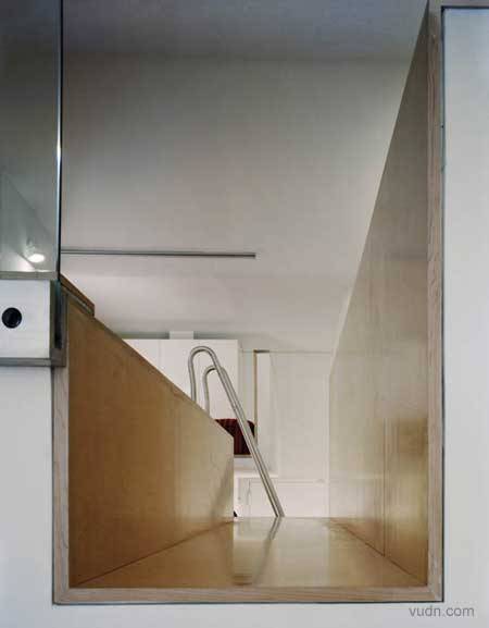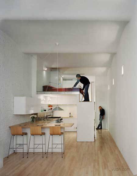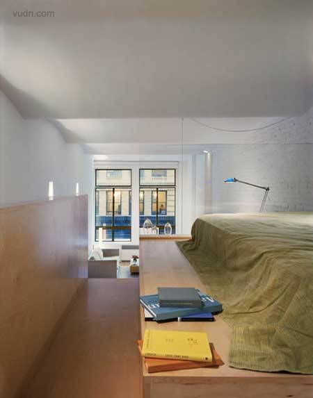 纽约Interlocking公寓室内设计。混凝土拱形天花板有起伏,两平台是由一个L形的T型台交叉,盘旋组成壁橱,从客厅到入境大堂,创造一个连续的视觉流动,而加剧了独特的功能, 所有的水平表面和T型台覆盖着枫树木材,而其余的垂直表面漆成白色。一个清晰的玻璃分割划分的休息区域,采用自然光照明,创造舒适的空间。