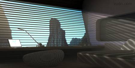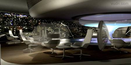 载人飞艇室内设计。将包括一间餐厅,一间图书馆,一间健身套房和浴室。