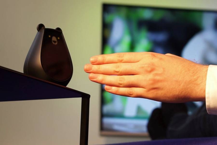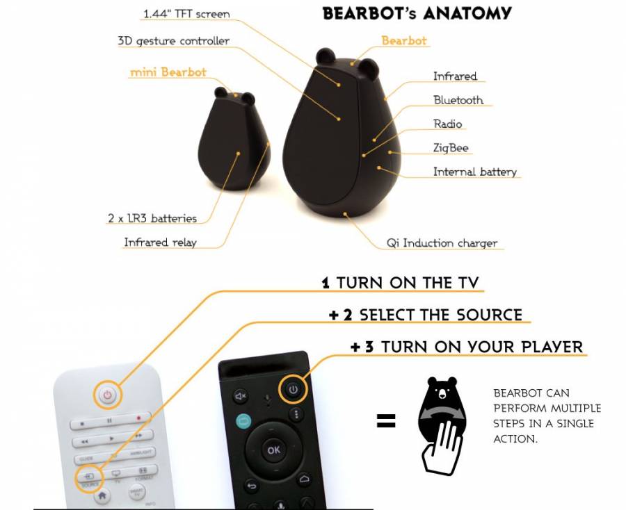 家里购置越多电器,需要用到的遥控器就越多,有时候不小心拿错,甚至想打开电视时才发现它不知失踪去了哪里。这是设计师 Vivien Muller 设计的万能遥控器Bearbot。它有什么特别?够呆萌啊!一只疑似走熊本熊套路的胖熊,鼻子耳朵嘴巴在 1.44 寸的 TFT 液晶显示屏上做着各种表情。通过蓝牙或红外线等连接后,用手指在它的小肚腩前做出不同指令,就能帮你控制家里的各种电器。