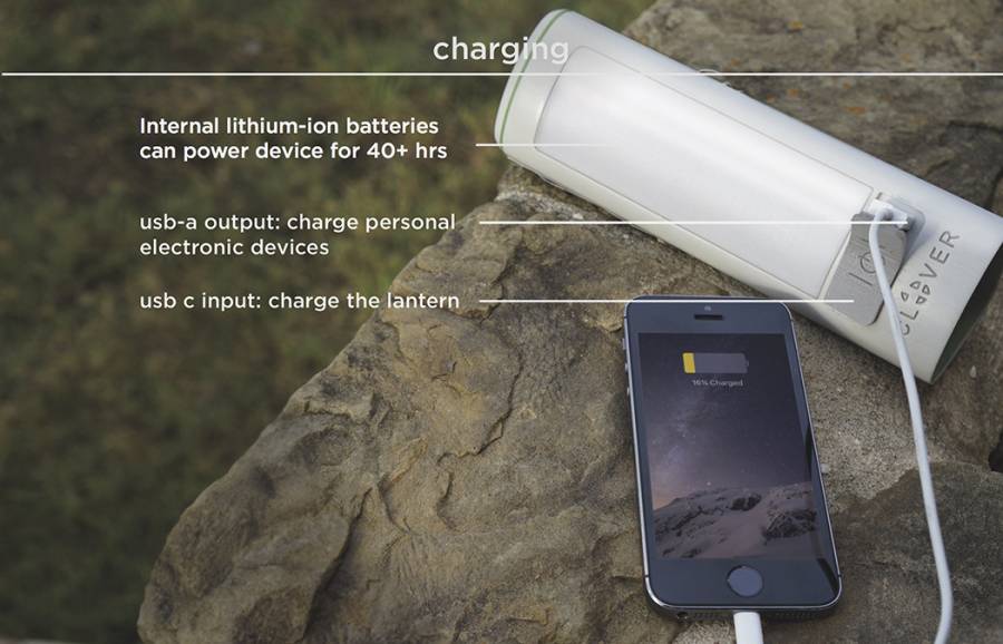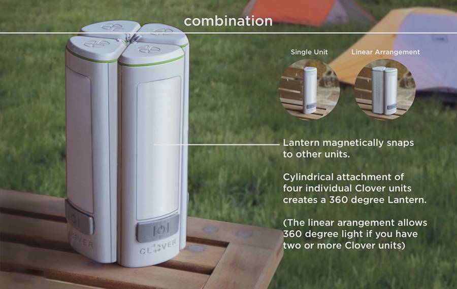 这是一款既能当手电筒,还能给手机充电的户外灯Clover。它附带了一个应用程序,允许你改变光的亮度和颜色。该应用程序还具有一个功能,在你需要帮助时可以让你闪烁紧急信号。
