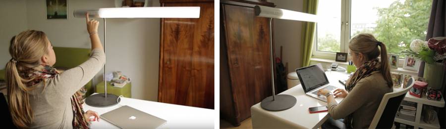 Heavn设计了一款名为Caffeine 的台灯,希望人们可以在自然光的节奏下进行办公。台灯提供了几种不同的照明模式,通过柱状灯管一端的按钮进行切换。室外模式下灯光会模仿一天内光照强度自动变化明暗,也可以根据需要切换成冷色或者暖色,前者的蓝色波长可以抑制睡眠,后者则会让人感到轻松舒适。