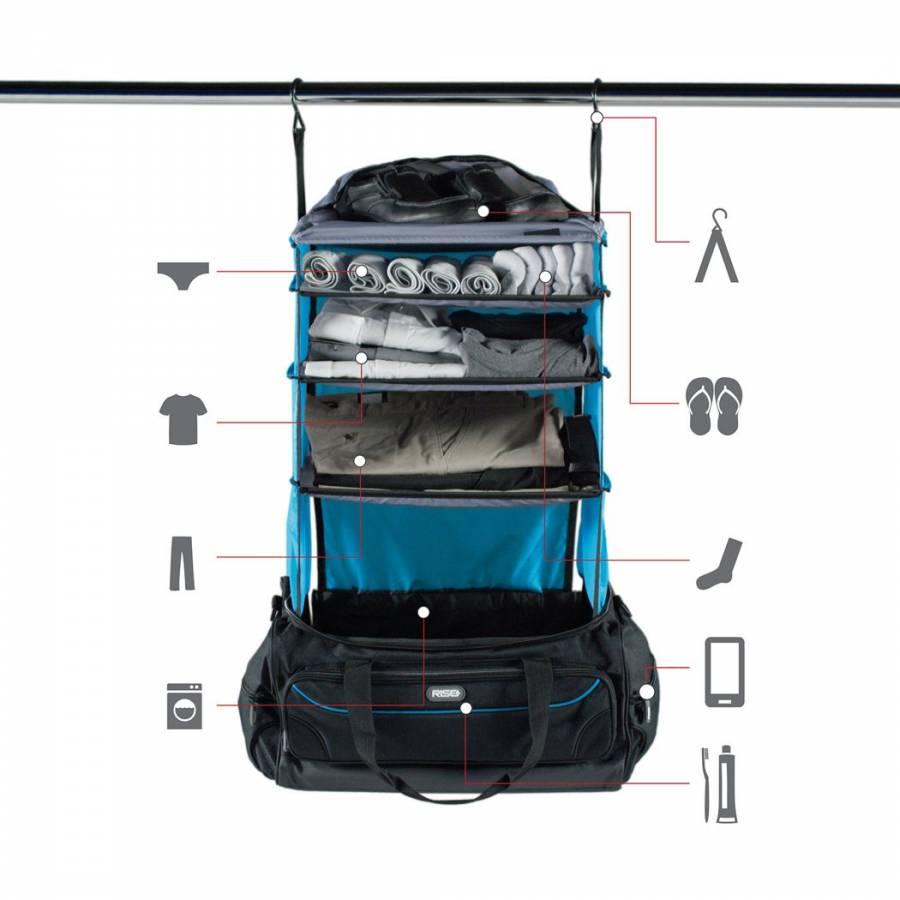 设计师Lee Renshaw设计的一款方便整理收纳的旅行包Weekender Bag,将衣橱放进旅行包内,衣物分层堆放,互不干扰,甚至还能挂到横梁上通风透气,所有行李一目了然。