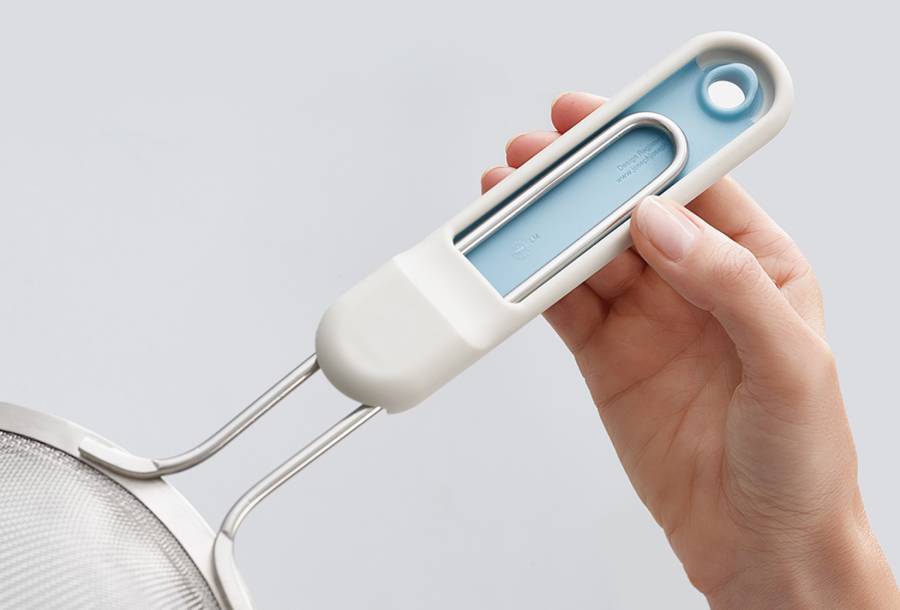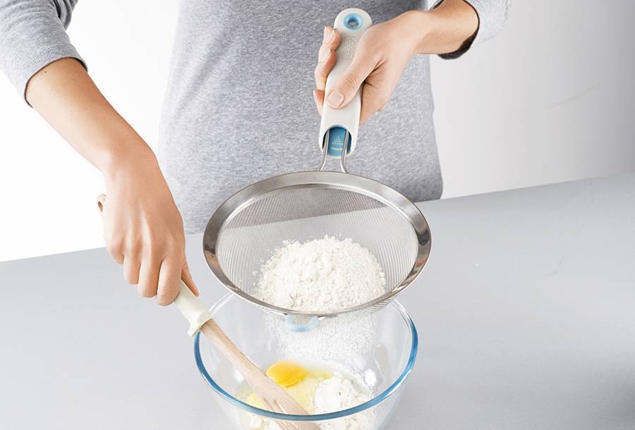 这是一款高效节省厨房工作时间的自动滤网,把手内藏有小弹簧,轻松摇一摇就能持续地继续把面粉晃下去,这样你就可以同时进行搅拌了。