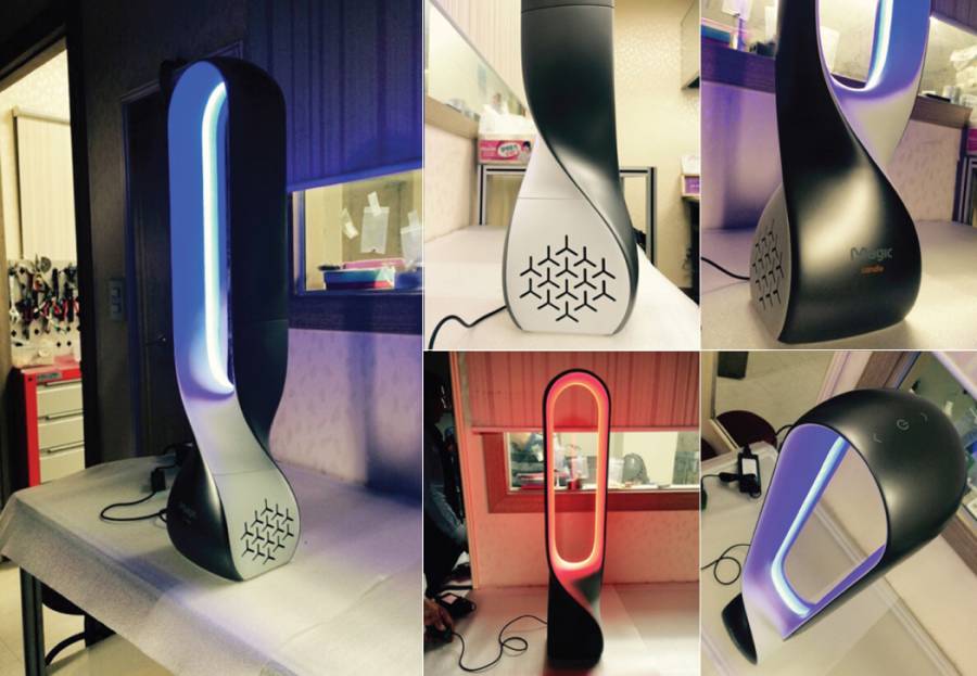 这是设计师 Edgar Yeo设计的一款空气净化器,目的是去除厨房里的油烟。净化器的轮廓的类似于戴森的无叶风扇,但它下面有一个扭曲的底座,配合内侧一圈霓虹效果的灯,增加了生活的绚丽。