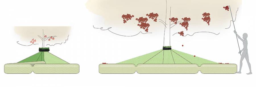 一张图就表明了这张网的巨大用途,只要缠绕树根周围,掉落的果实便会自动滚到边缘,而且是软着陆,保证果实不被损坏。