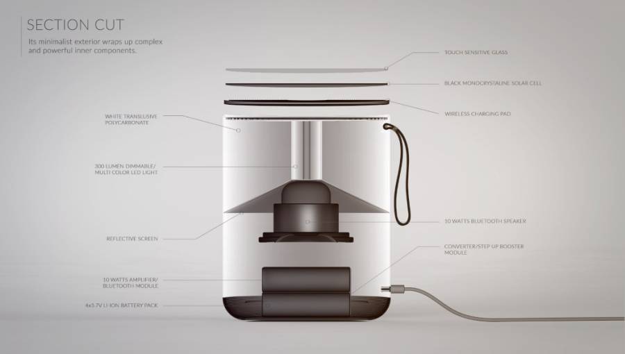 设计师Alexander Main设计的这款Sollys 太阳能灯可以随处摆放或随身携带。顶部是一个黑色的单晶硅太阳能电池,可以收集太阳能。为防止受天气影响,还可以通过室内充电来照明。用手轻点顶部就可以点亮内部的 LED 灯,一次供电充足可以持续发光 80 个小时。下部不起眼的地方还隐藏着一个蓝牙无线音箱,通过手机 app 控制,就可以听自己喜欢的音乐。Sollys 太阳能灯还可以发出 256 种不同色彩的光线,以营造不同的氛围,与音乐搭配。