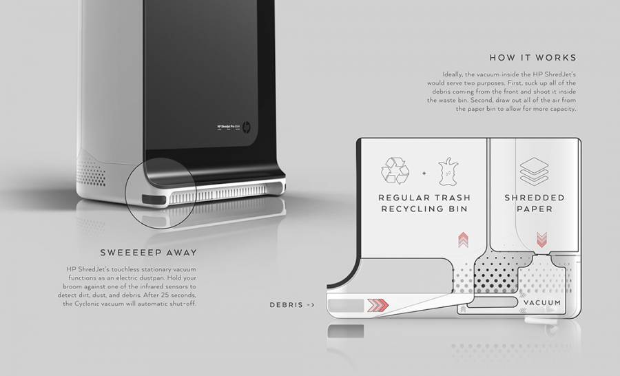 Matteo Iavicoli设计的这款多功能垃圾桶将办公室能用到的组合在一起,它除了是一个垃圾桶,还是一个吸尘器和一个碎纸机。内置了三种分类,可回收、不可回收,以及碎后的纸。当将垃圾扫到垃圾桶旁边后,底部真空吸尘会自动吸入,少了簸箕的麻烦。