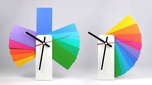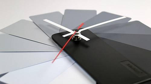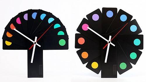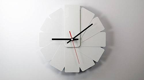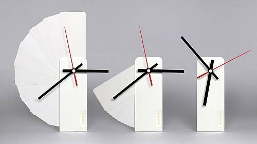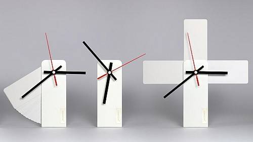 这盏挂钟将 12 个小时用 12 张长方形铝片代替,没有具体的刻度,只有相邻之间的小的缺口来区别具体的时间。实际上它可以打开成任何的角度或重叠成其他形状挂在墙上,仅靠三根指针的方向来判断时间,以打破人们对时间的固有想法。它更方便之处在于可以收成一个长条形来运输。