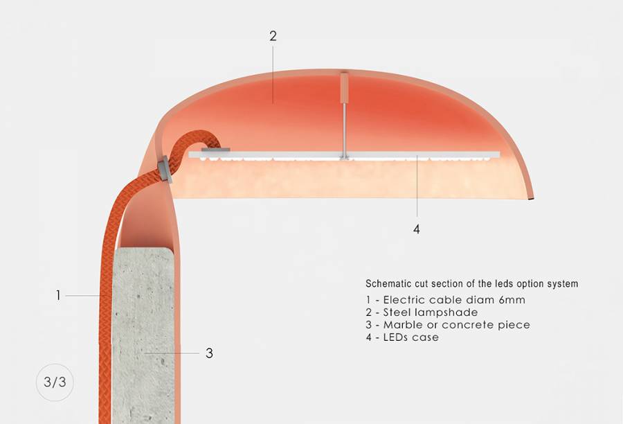 这是一款外形很普通的灯,但灯的底座和灯罩是分离的。将底座固定之后,这盏灯的灯罩就可以360°转动,来改变光的方向。灯的底座是一块圆盘带一根圆柱,用大理石或混凝土做的,显得厚重。可以搭配以黄铜等材料的灯罩,直接插在圆柱上,轻盈而富有色彩的变化。