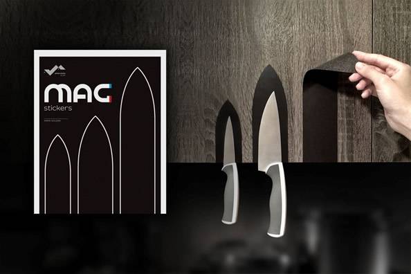 厨房磁性刀架现在有很多,但安装比较麻烦,需要在墙壁上打洞,一般人还真搞不来。而这件设计就简单很多,贴一贴即可。mag stickers是一张有磁性的贴纸(乙烯),根据刀型有三种尺寸,显然不是为中国刀具而设计,一把砍骨刀分量就不轻,而西餐刀比较轻薄,吸附在上面也不易掉落。使用就非常简单了,找个合适位置,贴上就能使用。