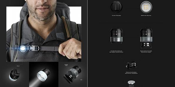 “Hive”是一款小巧便携的照明设备,采用纽扣电池供电,它可以夹在旅行者的包包、衣服和头带上,提供各种用途的照明。另外,还有一个独特的设计,就是灯具有一个螺口,它和饮料瓶通用,加满水拧上Hive 就变成了帐篷照明灯。