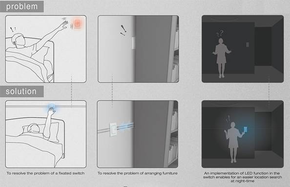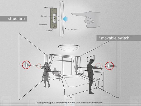 不管是家里还是办公室墙壁开关始终是固定在那里,开和关我们需要到开关的位置才能操作,而这款设计让你可以移动墙壁开关,移到你顺手可接触的位置。它使用条件首先要安装一条双轨道,通过轨道开关就可以自由的移动,如进入房间,即可移动到房门的位置,睡觉就移动到床的位置,如此可方便随手开关。