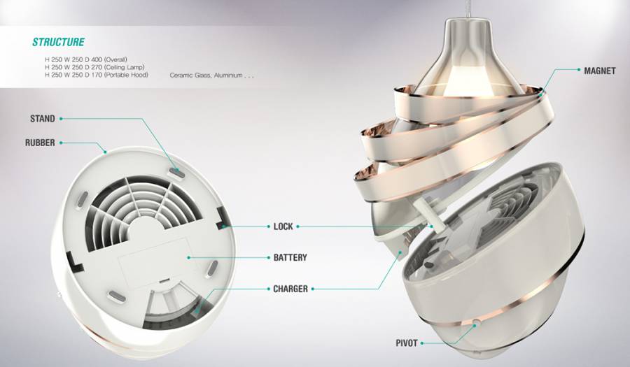 设计师Seoyeonjin Choi设计了这款便携式油烟机,不光能吸走油烟,它还可以作为一盏吊灯,照亮你的厨房。这款油烟机没有繁琐的安装程序,在你做饭的时候,直接把它放在桌在上就能使用。其内置的大吸力风扇,可以将油烟吸附到内部。在其内部,则带有完善的过滤系统,包括活性炭滤网、HEPA滤网等等,可以将油烟等物质进行过滤,让油烟不再四处飞散。