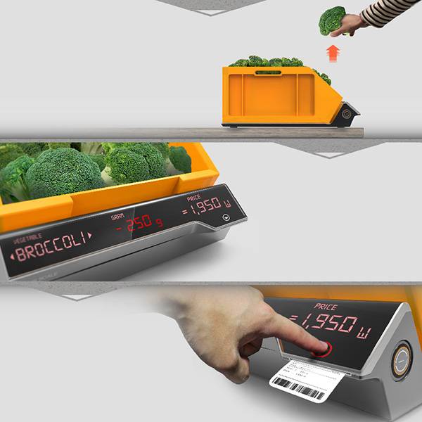 通常情况下,我们在超市买菜的方式都是选好菜并用袋子装起来后再拿去称秤,可这款电子秤通过做减法的方式让这一切倒过来了。例如,如果你准备买番茄,番茄托盘下面的电子秤显示屏会显示当前番茄的总重量,当你取出选好的番茄以后,电子秤会减去相应的重量然后将对应取出番茄的价格标签打印出来,这样不仅节省了很多时间,还省去了我们排队称秤的麻烦。