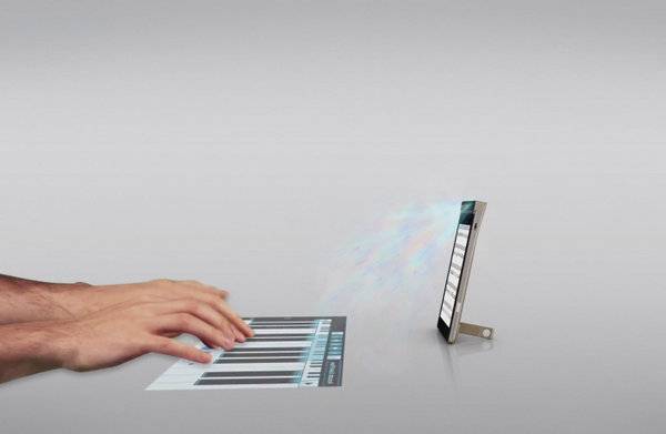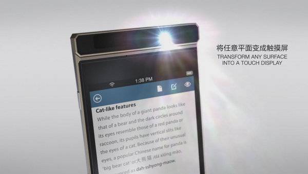 这款智能投影手机内置了激光投影仪、红外运动检测器和高性能算法,最大特点是让投影的页面可以作为与手机交互的界面。用户可以利用此款手机在桌面上投射一个大虚拟触屏,通过虚拟键盘输入内容,实现绘图、计算、笔记等多项功能。不仅如此,只要打开产品的投影仪功能,用户便能将一面墙变成一个放映厅,看视频,做演讲,甚至可以通过手势操作。