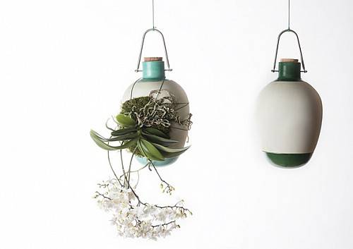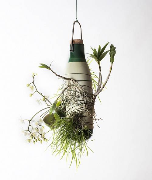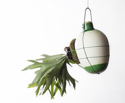 这是一组由白色陶瓷材料制成的花瓶,并配有不锈钢材料的把手,以及木质瓶塞与挂绳。这些吊挂的花瓶为室内附生植物提供了一种别样的生长环境,不仅能够看到它们的叶子与花朵,就连它们的根部也纤毫毕现。这使得人们能够从整体上对这些植物的美感有一个较为全面的观看与欣赏,在这些“附生”花瓶中,植物的根部不在隐藏在花瓶里内,而是把花瓶当做雨林里的树木与植物一样附着在上。