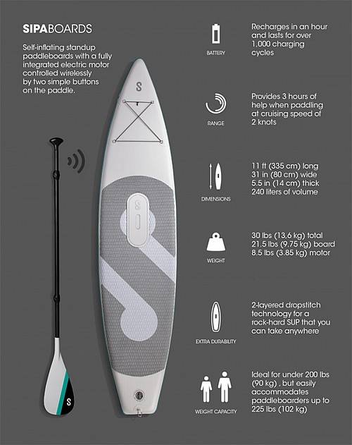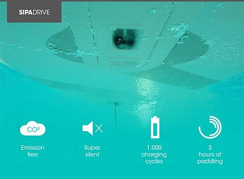 Sipaboard号称世界上第一块自充气式桨叶冲浪板,其内置的螺旋桨即可推进着冲浪板前行又可当做气泵,仅需5-6分钟的热身时间就能完成各项设置。内置充电电池允许最大航行速度3节,但只能坚持1小时,如果速度降低则延长至2、3小时。此外,你可以将其与手机APP相连,这样会在电量较低时获得及时的提醒。
