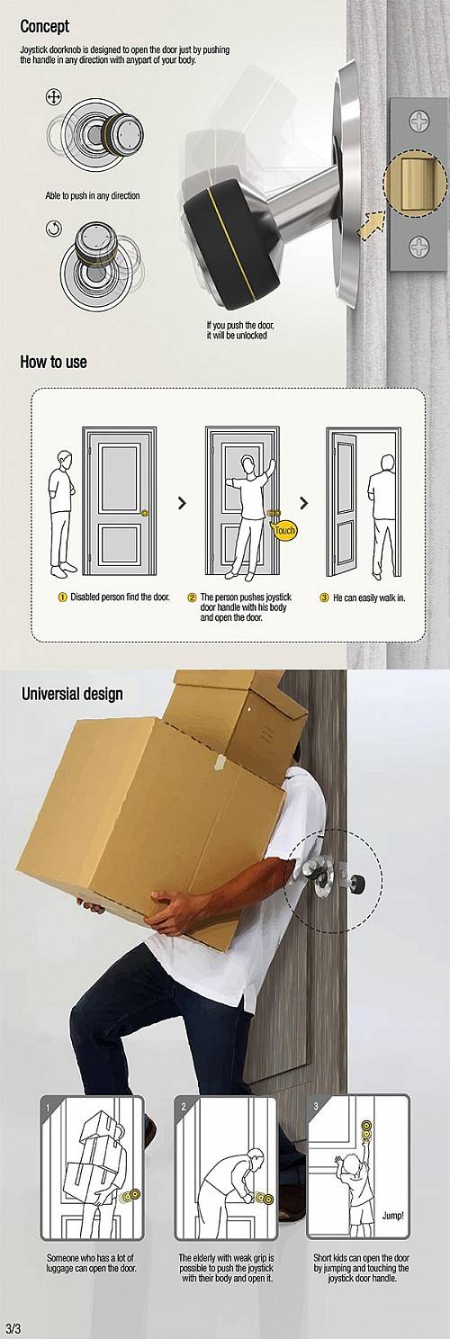 这个操纵杆门把手的设计可以从各个方向来开门把手,如果你双手拿着纸箱或者别的重物你只需要用胳膊抵住操纵杆稍微用力就可以打开门,而够不着把手的孩子也可以踮起脚尖推一下操纵杆也可以打开门,当然打开门的前提是要打开门锁才可以使用把手,打开门锁的方法可以有很多种,可以使用钥匙、密码或者是声控以及瞳孔等。