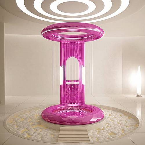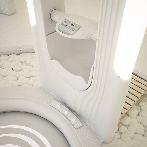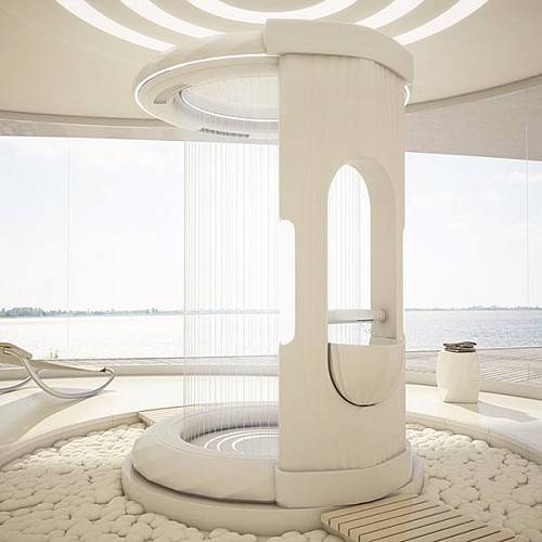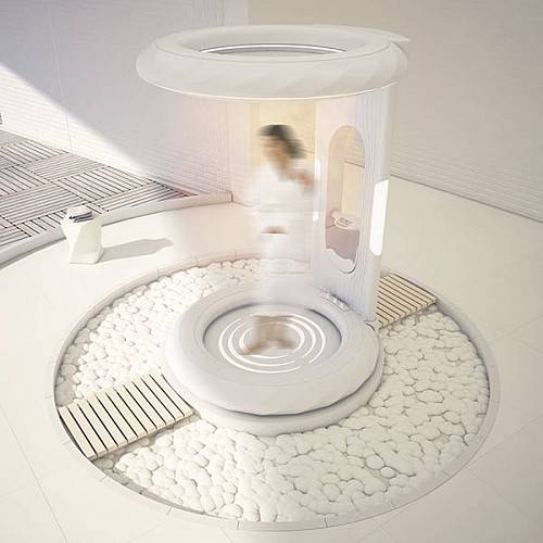 设计师Naser和Taher Nasiri提出了新的浴室设计理念——去掉墙壁和毛巾。这款浴室在人们眼里就像是《星际迷航》中的运输舱。浴室顶端的小圆环中装有淋浴头,同外部的大型圆环相结合,用来模拟阵雨和汹涌瀑布的水流。浴室在有效半径内都具有设备齐全的排水设备,所以它不需要墙壁。用户还可以通过小型数字面板或者是浴室内的控制瓣来调节水压和水温。整体设计还包括具有特色的空气干燥器,所以你根本不需要毛巾。