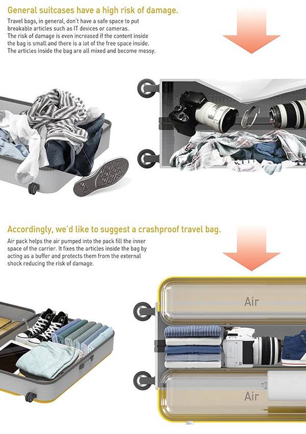 为了避免旅行箱的空间不够,很多人都会尽量选择较大的旅行箱,但是这样就会遇到旅行箱装不满的情况。如果旅行箱装不满,里面的物品就会乱成一团,很有可能会在路途中损坏。为了能够让旅行箱里面的物品随时都是满满的,Eun ji Jeong设计了这个安全气囊行李箱填充物。它可以根据用户的需要改变形状和体积,很好的填补了旅行箱里的剩余空间,而且不会增加旅行箱的重量。没用的时候只要将空气放出便可放在旅行箱的口袋里,不会占用任何空间,非常的方便。