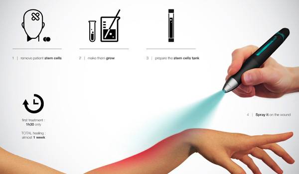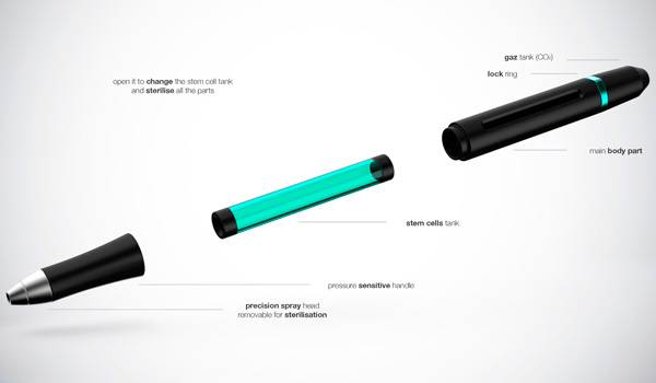 对于每天都需要烹饪食物的家庭主妇来说,一时失误导致的烫伤是无可避免的。为了及时的处理烫伤,避免影响正常的生活和工作,Martin Duhayon设计了这个烫伤治疗笔。这是一个非常实用的家用医疗工具,当用户被烫伤后,只要用它将药液均匀的喷洒在烫伤处,药液就会给烫伤区域内降温,并刺激皮肤细胞快速的成长和补充。如果烫伤严重的话可以要一个星期才会好,但是有了它,只要两个小时,烫伤就会恢复,不留任何的痕迹,非常的健康,有效。