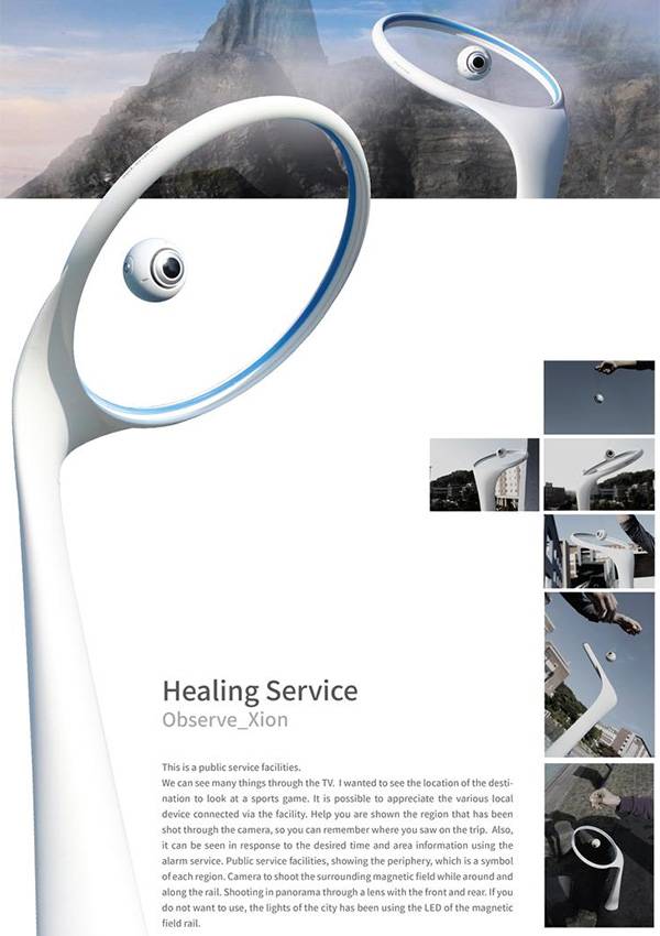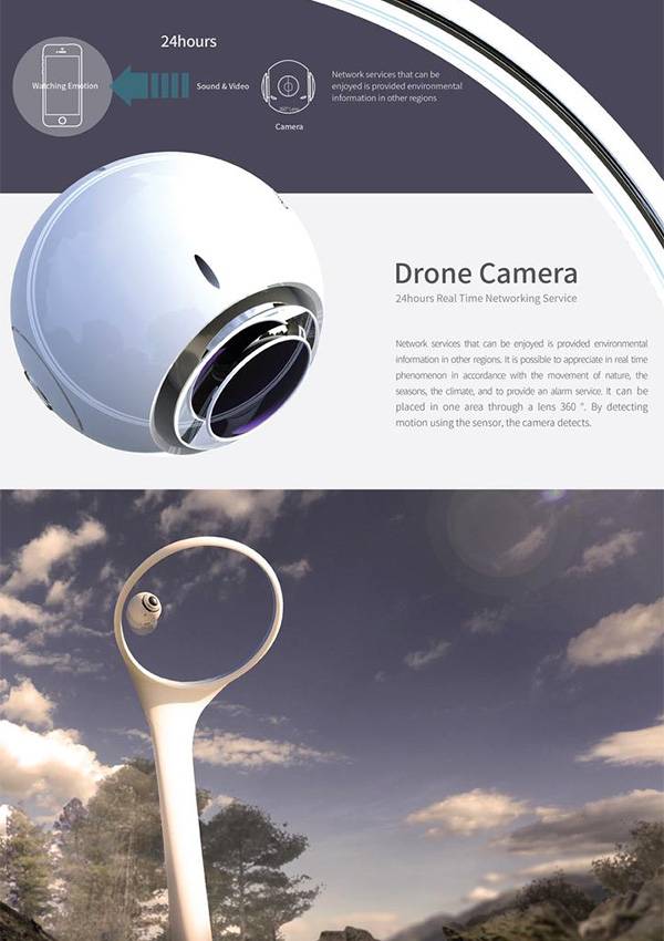 为了我们的社会安全和稳定,很多公共地区都必须要安装监控摄像头,以获取和保留重要信息。然而现在所使用的监控摄像头的转动角度都受到了很大的限制,无法达到360度自由转动,因此很有可能会产生摄像头无法拍到的死角。为了让摄像头的功能最大化,在重要地区达到0死角和灵活的旋转,Hoyeon Kim等人设计了这个Xion摄像头。和普通的摄像头不同的是,它是漂浮在一定特定的区域内的,可以自由的旋转,看到任何的角度。除此之外,它还可以和智能手机无线连接,改变方向,获取视频信息,更加方便,更加实用。