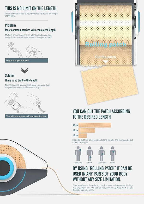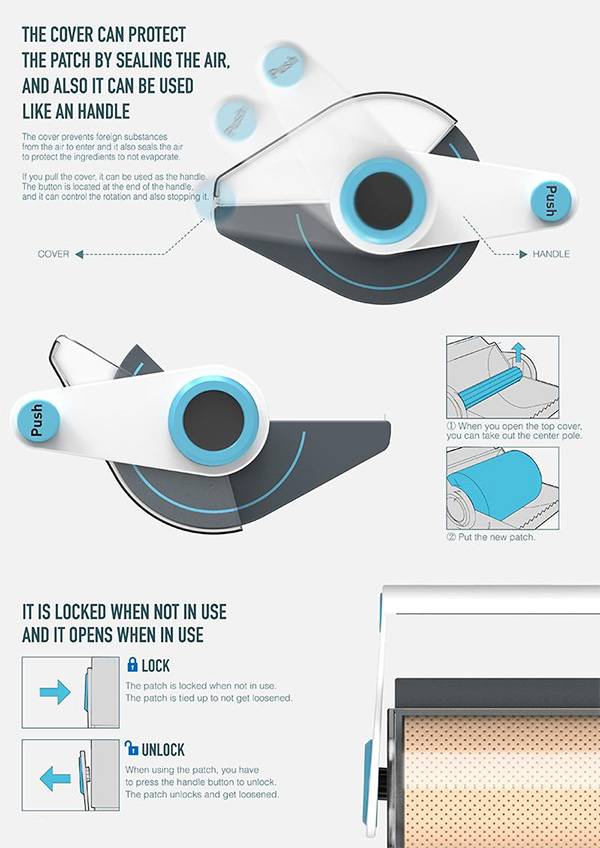 生活中总是充满了各种各样的危险和意外,因此受伤流血是再说难免。其实最让用户烦恼的并不是受伤本身,而是如何进行包扎。用创口贴的话太小,很多时候尺寸不合适,使用绷带又过于麻烦,不处理又很容易感染。为了解决用户包扎伤口的烦恼,Eun ji Jeong和Na young Kim设计了这个随切随用创口贴。因为大多数的伤口都是条状的,因此它将很长的绷带收纳于卷筒之中,根据伤口的长度深度,用户可以随意的裁切,只要轻轻的将它粘在伤口上就可以了,非常的方便。