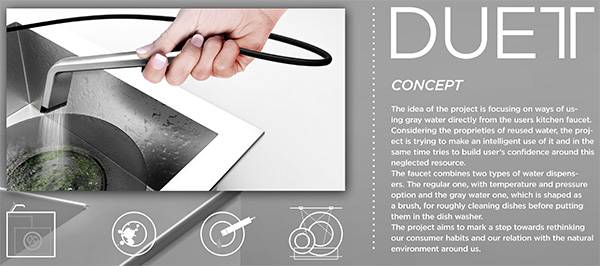 现在有了水龙头用水非常的方便,但是方便之后,很多用户用水就会造成浪费,为了保护水资源,做到合理用水,Bogdan Ionita设计了这个智能水龙头。它可以通过无线和手机连接,以此来设置水龙头不同用途的出水量和出水速度。除此之外,它拥有两个出水口,一个为标准水龙头,另一个为花洒式水龙头,这样用户使用起来更加的方便,不在受水龙头和水槽位置的限制。